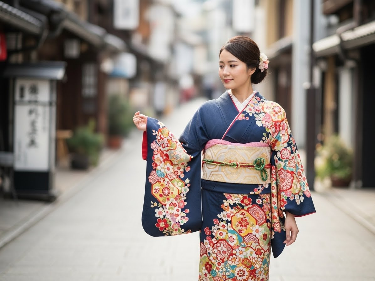 Floral kimonos with multiple tones can look incredible on camera, especially in Osaka’s colorful neighborhoods.
